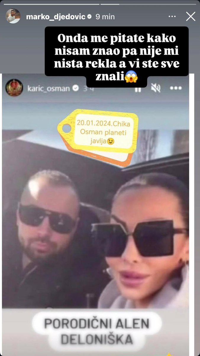 - Onda me pitate kako nisam znao, pa nije mi ništa rekla, a vi ste sve znali - napisao je Đedović obzirom da je Osman Karić 20.01.2024 objavio sliku Aneli i Alena.