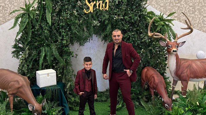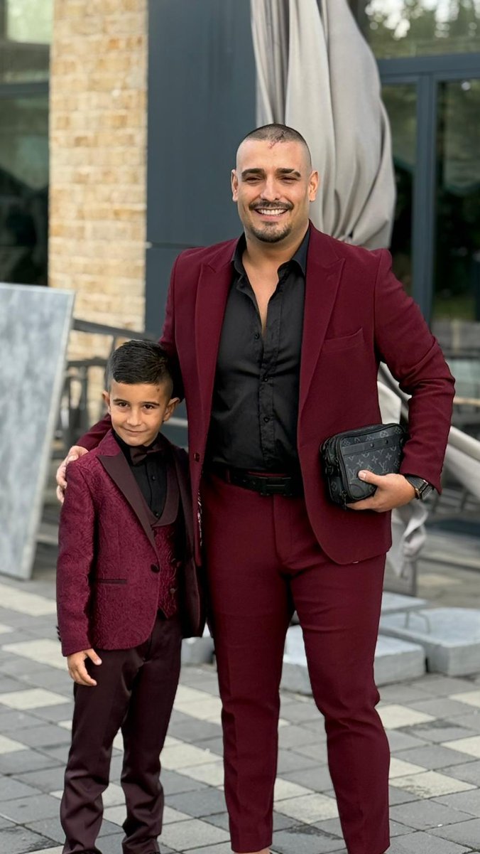Pevač je prvi došao na slavlje zajedno sa sinom Aleksejem, kojeg je dobio iz veze sa Marinom Gagić. Otac i sin imali su iste autfite, svečana odela u bordo boji, a na nogama lakovane cipele.