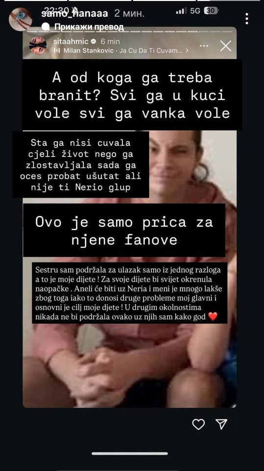 - Sestru sam podržala za ulazak samo iz jednog razloga – a to je moje dijete! Za svoje dijete bih svijet okrenula naopačke. Aneli će biti uz Nerija i meni je mnogo lakše zbog toga, iako to donosi druge probleme. Moj glavni i osnovni cilj je moje dijete! -napisala je Sita, a Hana je podelila njenu obaju i odgovorila joj.