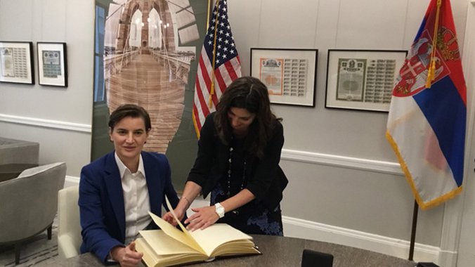 Premijerka Brnabić upisala se u Knjigu utisaka i poklonila Kaningham knjigu o Nikoli Tesli. U posveti, Brnabić je napisala: „Nikola Tesla bio je jedan od najvećih naučnika i inovatora. On je bio i snažna veza naše dve zemlje i dva naroda. Velike ideje i ljudi pokreću svet napred. Hvala vam što ste ličnim primerom ohrabrili sve žene na svetu da se ne plaše da idu u susret svojim snovima“.