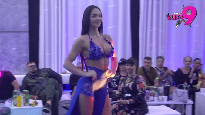 Dušica Đokić naredna je prošetala pistom u elegantnom izdanju, a za ovu rundu odabrala je plavi gornji deo s cirkonima i šljokicama dok je dole izabrala neke pantalone - šorc sa zanimljivim detaljima.